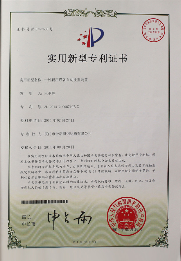 Giấy chứng nhận sáng chế máy cán định hình có thể hoán đổi