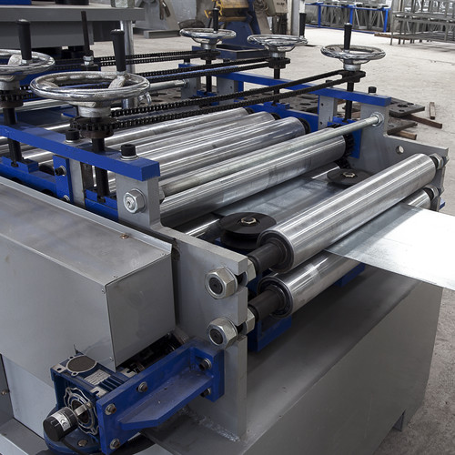 Hai con lăn dẫn vật liệu nạp (một con lăn lên và một con lăn xuống) và 5 con lăn cân bằng (2 con lăn lên và 3 con lăn xuống) để làm thẳng.